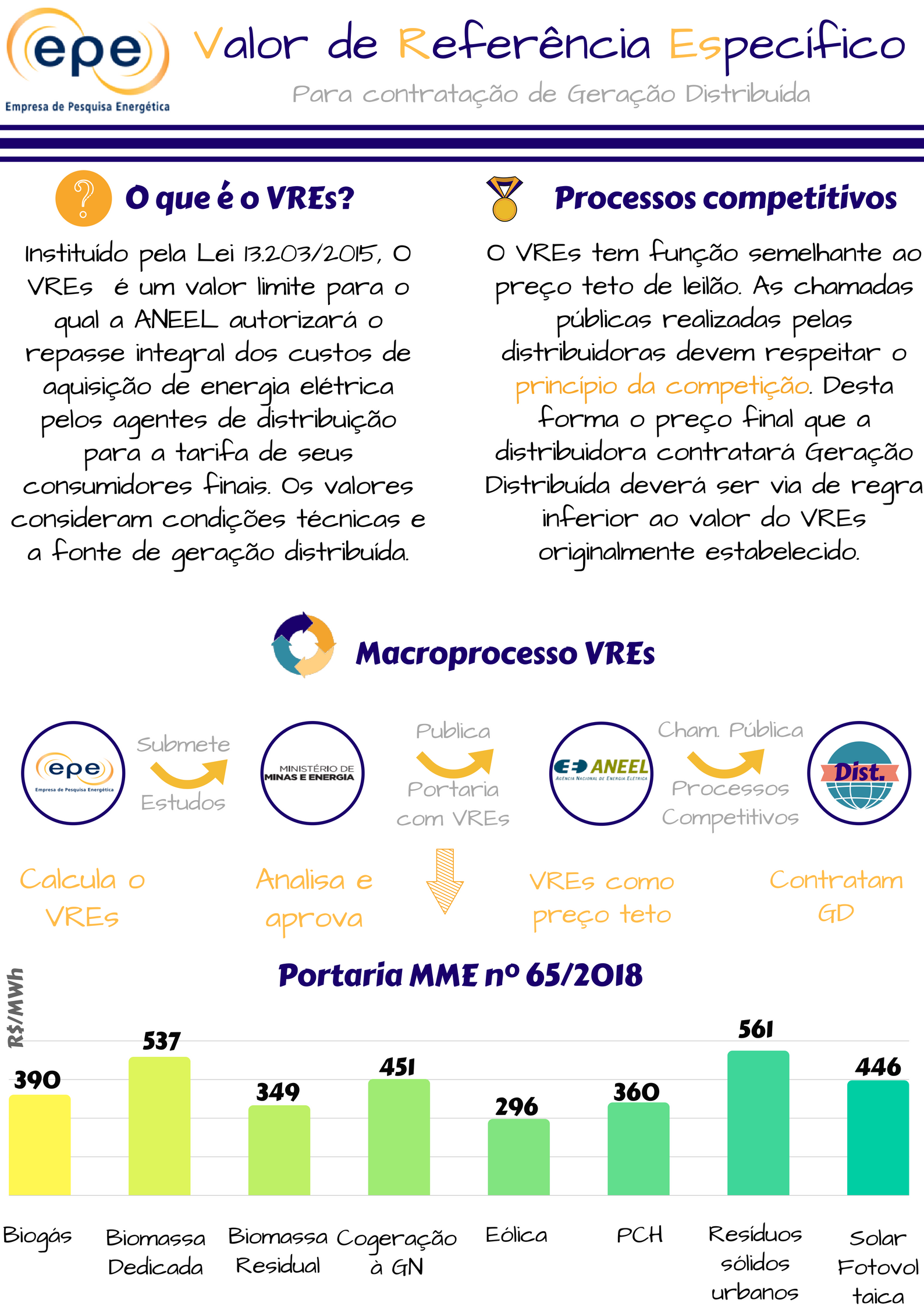 Destaca-se que a geração distribuída à qual se aplicam os VREs não deve ser confundida com a micro e minigeração distribuída, regulada pela Resolução Normativa ANEEL nº 482/2012. Nessa modalidade, aplica-se atualmente o sistema de compensação de energia elétrica (net metering), não envolvendo compra e venda, tampouco o VREs. O infográfico abaixo ajuda a compreender melhor os VREs, os processos e macroprocessos.