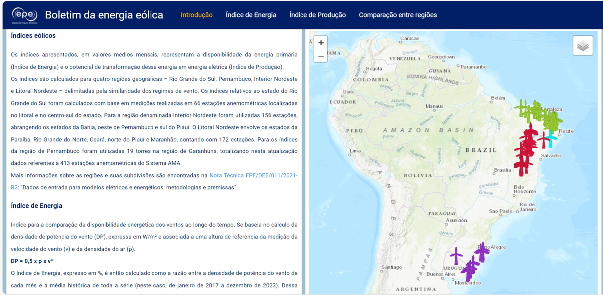 A EPE desenvolveu o Dashboard de Energia Eólica Onshore visando oferecer uma ferramenta interativa a diversos usuários para fins de visualização e consultas acerca dos parques eólicos existentes no Brasil, bem como daqueles em perspectiva.